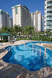 Located in Barra da Tijuca, in a residential area, with quiet, tree-lined streets that provide a pleasant feeling of well-being. It is near the Convention Center, the Rio Design Mall and the Barra Shopping. Easy access to the Tom Jobim International Airport and Santos Dumont Airport through the yellow line. All the apartments have balcony, sea or mountain view, with electronic card access, central air conditioner, work station with two phone lines, refrigerator, radio, cable TV, personal electronic safe, broadband internet by purchasing access card and equipped bathroom. Internet is free when it’s used at the apartment. Services and Facilities: Bilingual receptionists; Coffee shop; Outdoor pool with waves; Complete gym with room for eight lifting, gymnastics and spinning, Jacuzzi and pool covered, steam bath and sauna; Full beach service with access by motorized raft and Business center with broadband internet by purchasing access card.